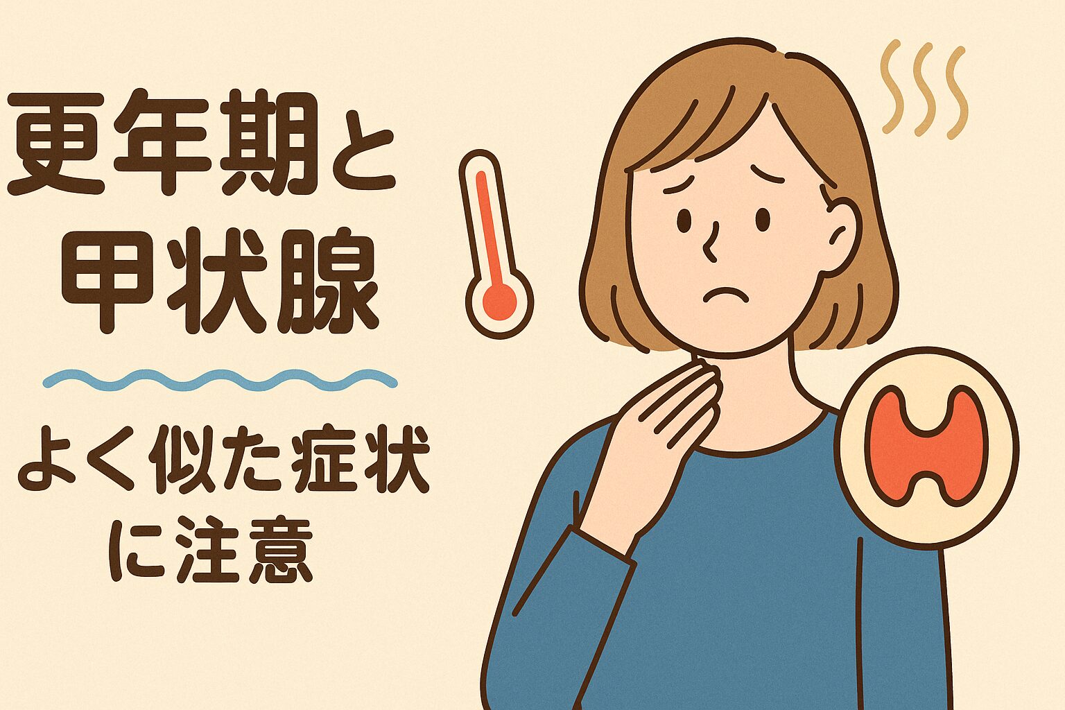 40代〜50代を中心に多くの方が感じる「更年期のつらさ」。ほてり、疲れやすさ、気分の落ち込み…。これらの症状は、更年期によるホルモンバランスの変化と思われがちですが、実は甲状腺の病気でも同じような症状が出ることがあります。
